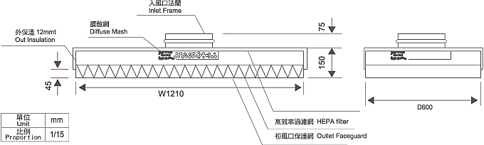 安裝於天花板之T-BAR架上,可直接與風管之軟管組合。體積小,重量輕,安裝容易,節省施工時間。為過濾網與箱體之組合體,適用於天花板系統之無塵室及其他各類潔淨場所